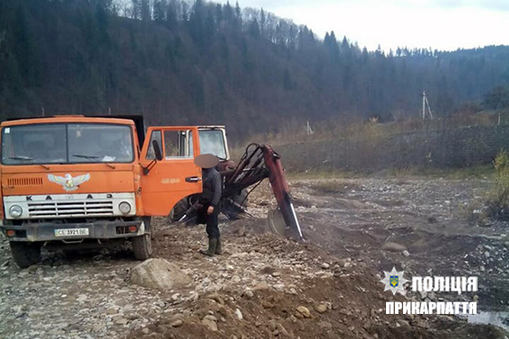 На місці видобутку правоохоронці виявили екскаватор марки «ЭО-2621 В», за допомогою якого чоловіки здійснювали завантаження піщано-гравійноїсуміші на автомобіль марки «КАМАЗ». При цьому вони не змогли пред'явитиправоохоронцям жодних дозвільних документів.