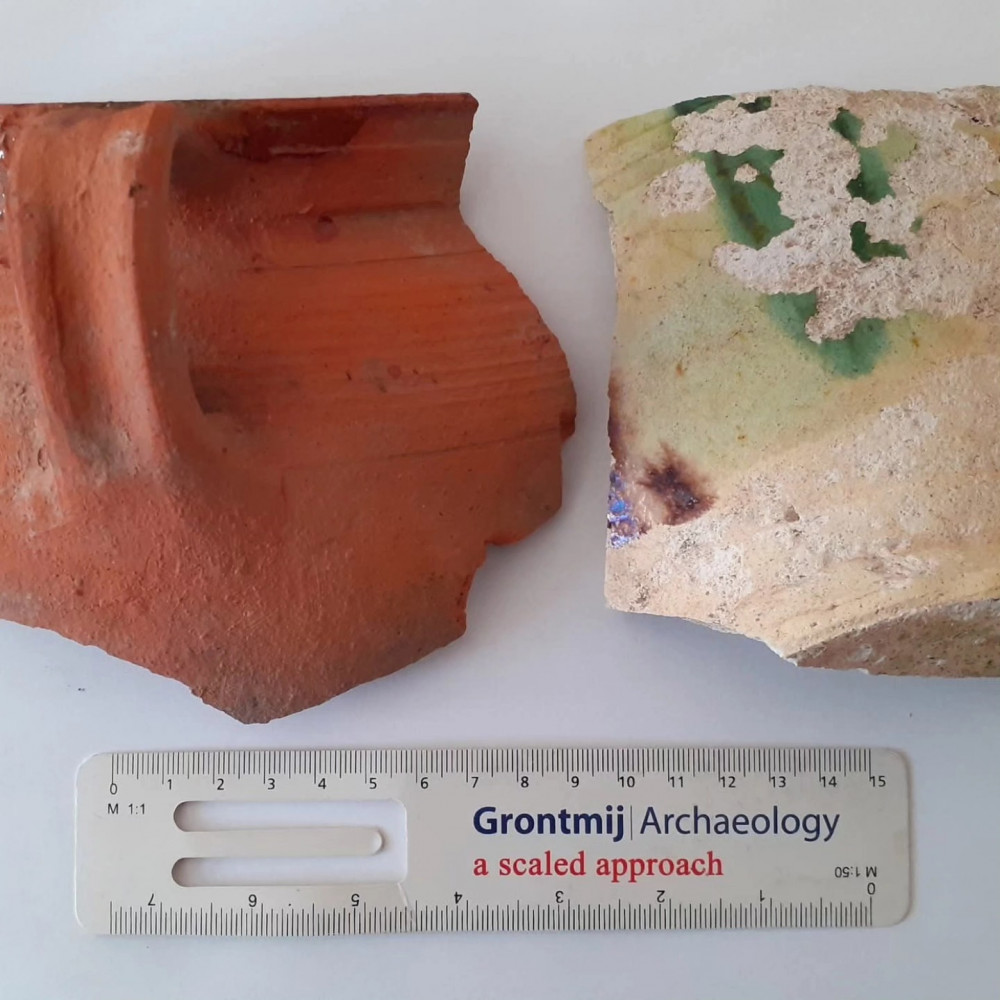 Окрім того, знайдено частини керамічного посуду, прикрашеного поливою світло-зеленого, зеленого та коричневого кольорів.