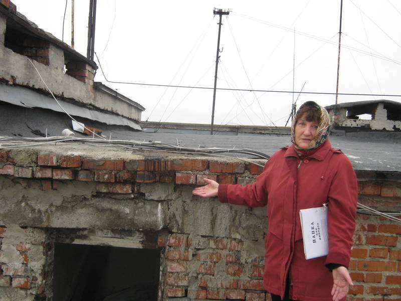Перед виходом на горище на нас зирять з кутів чорні грибкові сліди від затікання. А на горищі — справжнє дивовище: жителі, рятуючи свої помешкання від затікання, самотужки придумали і змонтували «систему водовідведення» з поліетиленових плівок, відер і мисок, трубок тощо. Виходимо на дах — краса: усе місто як на долоні! А на даху — покинута будівельниками бочка з-під смоли, яка «співає» на вітрах під акомпанемент непоприкручуваних відливів. То тут, то там лежать залишки будматеріалів. Люди кажуть, що під час вітрогонів ловили їх по всій прибудинковій території. Руберойд, приліплений якимось мазутом замість смоли, повідставав, погорбився, і вітер активно задирає його з покрівлі. Між стіною парапетів і стяжкою — тріщина, з’єднання незавершене і незатерте цементним розчином та незасмолене. Добре «русло» для стічної води під час дощів і снігів. А мешканцям в «ЄРЦ» пояснили, що, мовляв, роботи незавершені. До речі, влітку обіцяли виконати ремонт даху за кілька тижнів. і не безплатно.