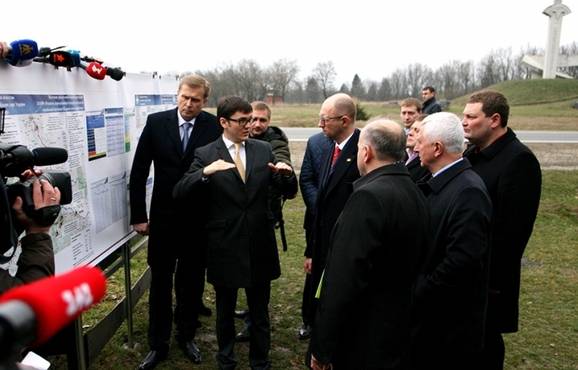 Нарешті дочекалися — до Крилоса Яценюк приїхав не сам, а з міністром інфраструктури Андрієм Пивоварським, головою Івано-Франківської ОДА Олегом Гончаруком та народним депутатом України Анатолієм Матвієнком. На високопоставленого гостя на місці вже очікували посадовці різних рівнів, а також парламентар Олександр Шевченко — він причетний до фірми, яка будувала цю дорогу. Як по команді, Арсеній Яценюк підійшов до банера, Андрій Пивоварський докладно відзвітував йому про виконану роботу, а також зазначив, що на це дорожнє покриття наразі нанесена тимчасова розмітка, котру найближчим часом замінять на пластикову. Після кількахвилинної наради біля стенда високопосадовці розповіли про мету свого візиту.