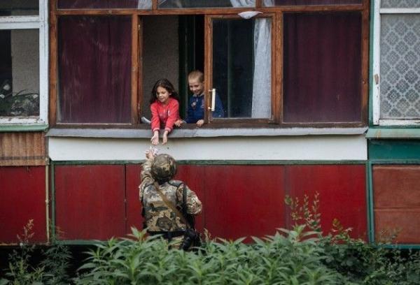 У соцмережах користувачі активно діляться світлинами зі звільненого силами АТО міста Попасна на Луганщині, на яких український солдат пригощає місцевих дітей цукерками і намагається їх розсмішити.