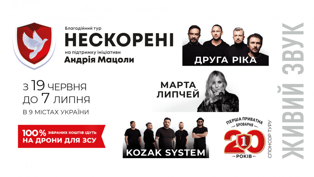 Найяскравіші рок-артисти України — KOZAK SYSTEM, Марта Липчей і «Друга Ріка» об’єдналися у великому благодійному турі “Нескорені”, мета якого – придбати FVP-дрони для ЗСУ.