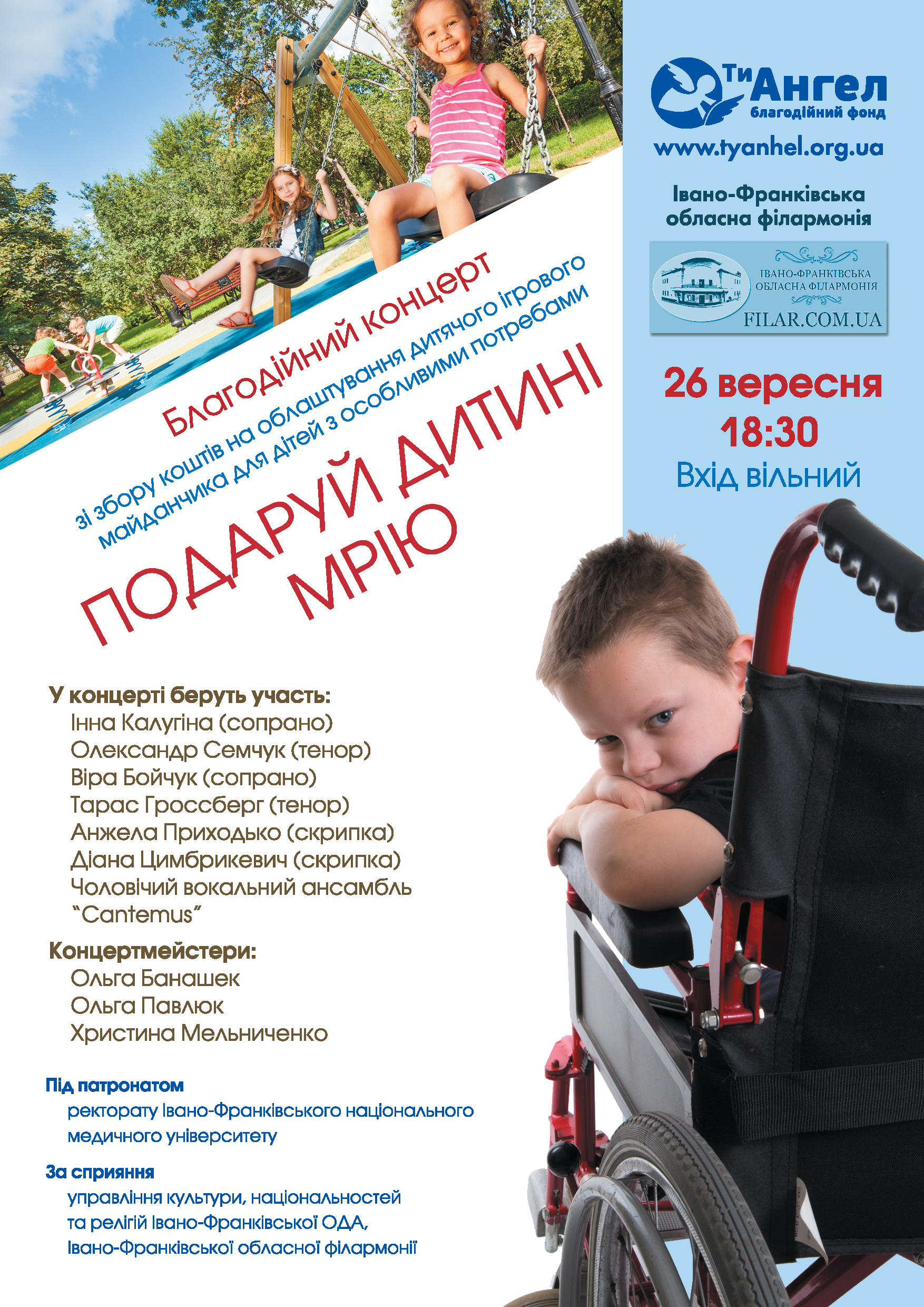 26 вересня о 18:30 год в обласній філармонії відбудеться благодійний концерт “Подаруй дитині мрію” зі збору коштів на облаштування ігрового дитячого майданчика, який буде встановлено на території Івано-Франківської обласної дитячої клінічної лікарні.