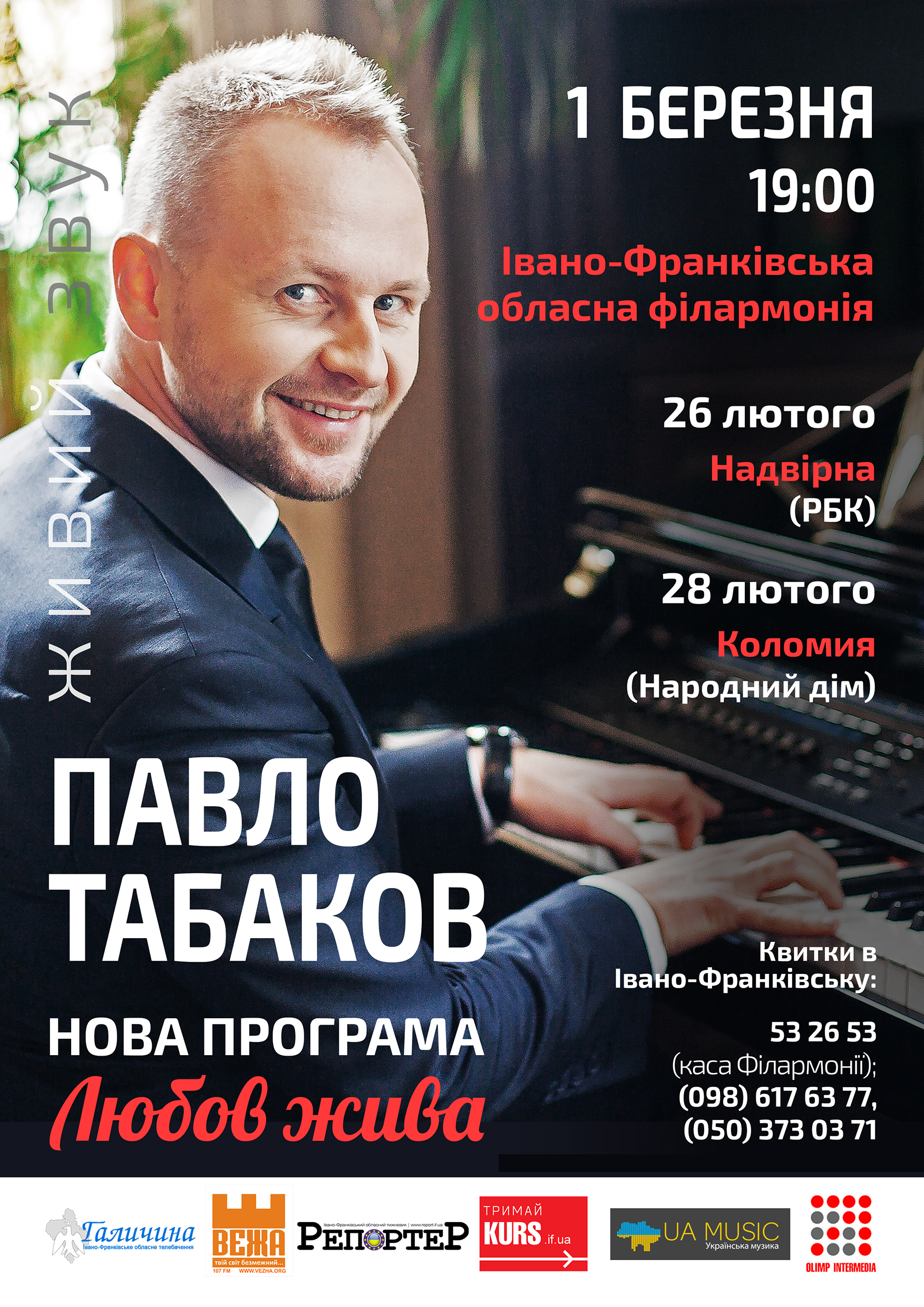 Перед Івано-Франківськом сольні концерти Павла Табакова «Любов Жива» відбудуться також у двох містах Івано-Франківської області: 26 лютого – у Надвірній (РБК, початок – о 17:00), 28 лютого – у Коломиї (Народний дім, початок – о 19:00).