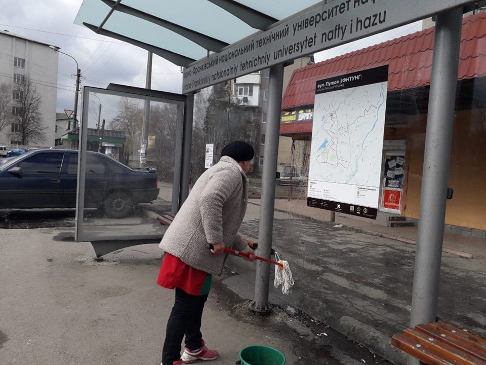 Бочка води та два відра миючих засобів: У Франківську помили зупинки