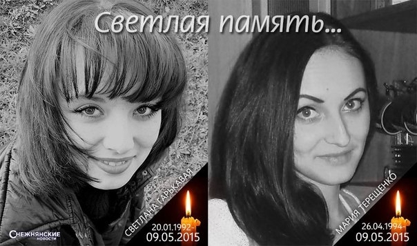 Дві мешканки підконтрольного «ДНР» міста Сніжне Донецької області – Світлана Гарькава і Марія Терещенко – були розстріляні бойовиками в районі кафе «Вечірка» пізно ввечері 9 травня.