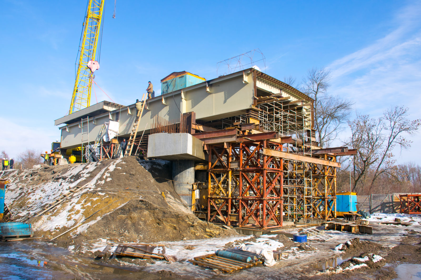 Вкінці лютого планують починати насування суцільної конструкції на опори. На цьому етапі на об’єкті стаціонарно працює не менше 40 чоловік. Науково-технічний супровід здійснює Інститут електрозварювання ім. Патона, спеціалісти якого перевіряють міцність швів конструкції.