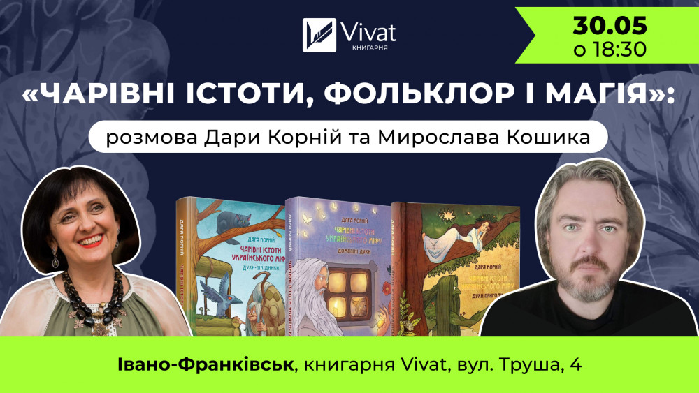 У книгарні Vivat (вул. Труша, 4) 30 травня о 18:30 відбудеться зустріч «Чарівні істоти, фольклор і магія» із Дарою Корній. Модерує історик, науковець Мирослав Кошик.