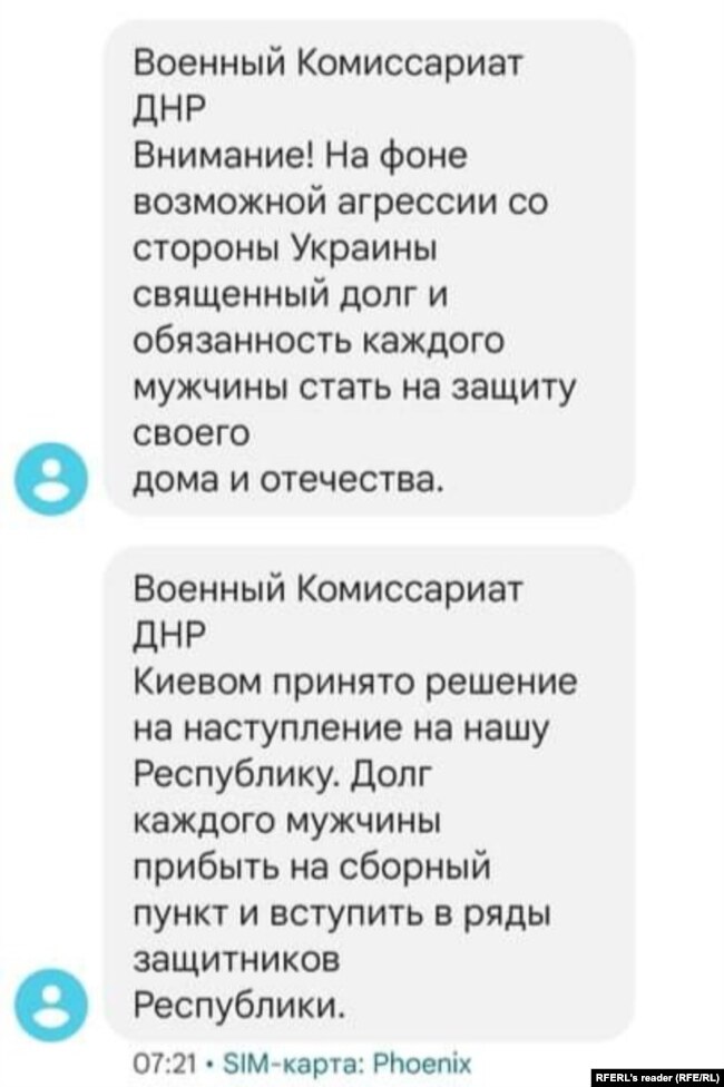 Про це проєкту Радіо Свобода Радіо Донбас.Реалії повідомляють жителі окупованих територій. SMS надходять від відправника Komissariat, у них стверджується, що Україна планує наступ на ОРДЛО.