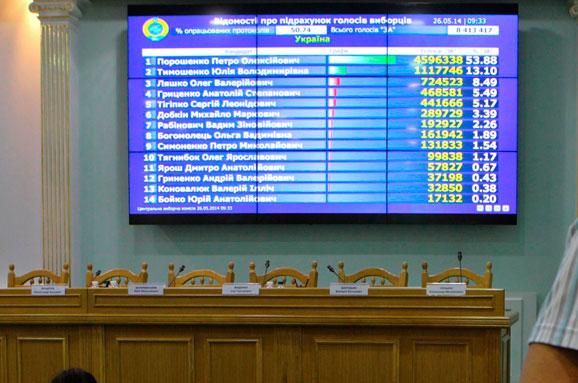 Згідно з даними обробки 60,15% протоколів в електронному вигляді за Петра Порошенка проголосували 53,72% виборців, за Юлію Тимошенко - 13,09%