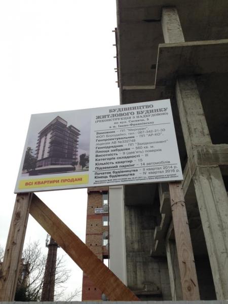 Управління Державної архітектурно-будівельної інспекції в Івано-Франківській області скасувало реєстрацію декларації про початок виконання будівельних робіт на реконструкцію з надбудовою багатоквартирного житлового будинку з приміщеннями громадського призначення, ІІ черга в м. Івано-Франківськ на вул. Саєвича, 5.