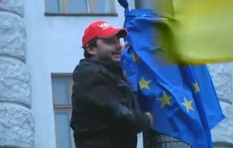 Під дверима кабміну лунали піротехнічні вибухи. В цей час група активістів з Івано-Франківська змогла прорватись крізь кільце беркутівців та підняти стяг Європейського Союзу над приміщенням Кабміну - повідомляє прес-служба івано-франківських ударівців.