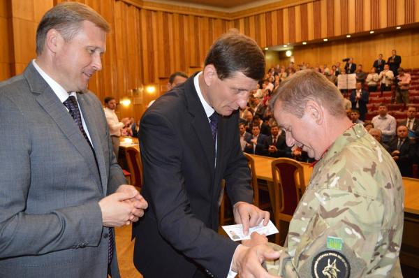 Опісля дванадцятьом учасникам АТО вручили нагороди «За бойову звитягу». А головний військовий комісар області Володимир Ярмощук зачитав наказ про нагородження відзнакою "За сприяння Збройним Силам України" депутата обласної ради Івана Даніва.