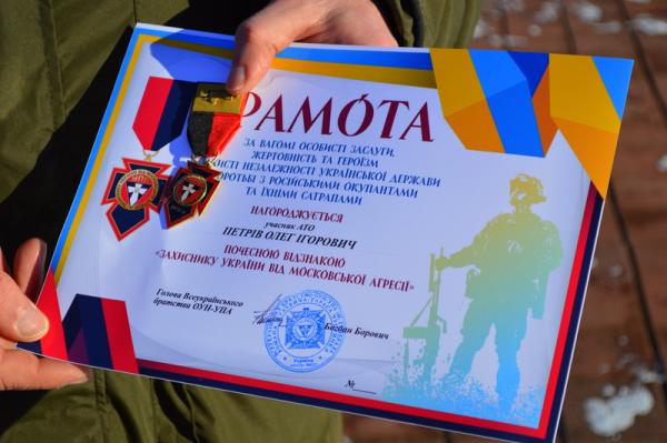 Грамоти та медалі "Захиснику України від московської агресії" вручили воїнам, які пройшли найгарячіші точки та отримали поранення. Оскільки сучасні бійці продовжують велику справу вояків УПА, нагорода зроблена у вигляді лицарського хреста ОУН.