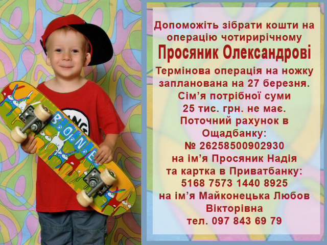 Якщо її не зробити, то маленького Сашка може паралізувати. Медики львівської клініки «Охматдит» погодились зробити операцію хлопчику. Запланували її на 27 березня. До цього часу потрібно зібрати 25 тисяч гривень. Такої суми у сім’ї немає. Тому просять усіх небайдужих дати шанс Сашкові на здорове і щасливе життя.