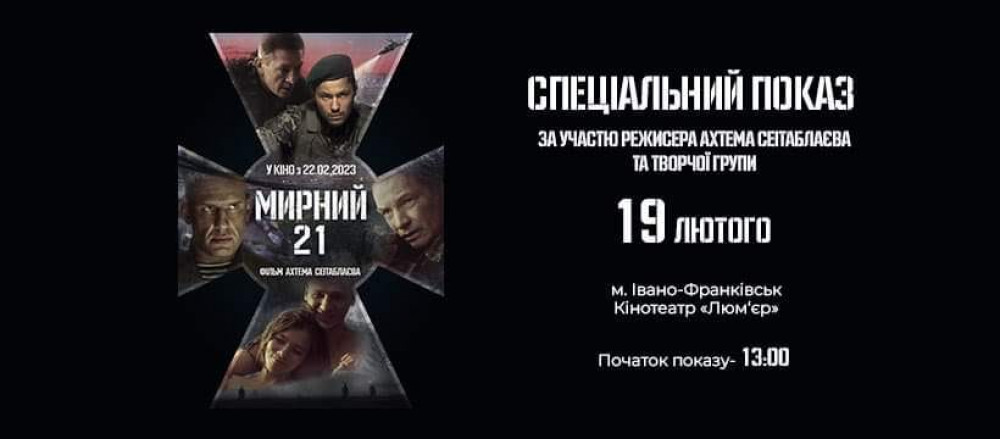 У неділю, 19 лютого о 12.30 в театрі кіно Люм’єр відбудеться пресконференція та допрем’єрний показ воєної екшн-драми «Мирний-21» за участі Ахтема Сеітаблаєва та творчої групи.