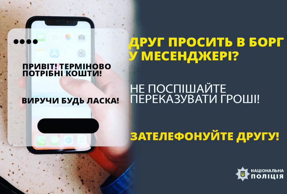 Жінка отримала повідомлення в одній із соціальних мереж нібито від своєї знайомої, якій терміново потрібні гроші і перерахувала на вказаний у повідомленні рахунок майже 8 тисяч гривень. Коли дізналась, що акаунт подруги зламано, і коштів вона не просила, жінка звернулась за допомогою до поліції.
