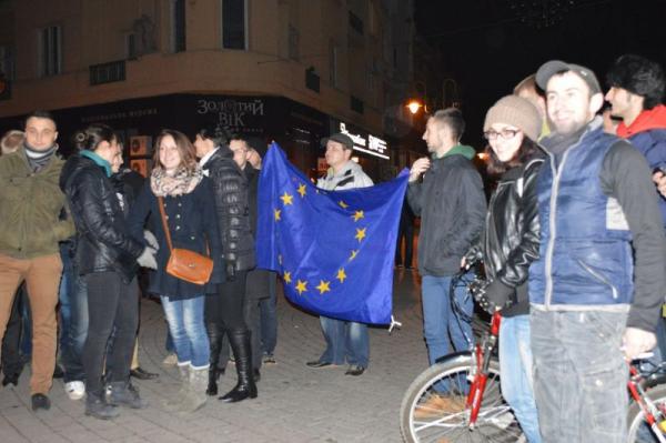 Того ж вечора іванофранківці на Вічевому Майдані утворили живий напис «ЄС» тримаючи в руках над собою сині та жовті папірці. А дійство було зафіксоване на відеокамеру із верхнього поверху будинку, який знаходиться поруч. Паралельно активно збиралися підписи під зверненням до президента України Віктора Януковича. Тоді ж провели перше віче із закликами до активних дій, а депутати зачитали своє звернення до президента.