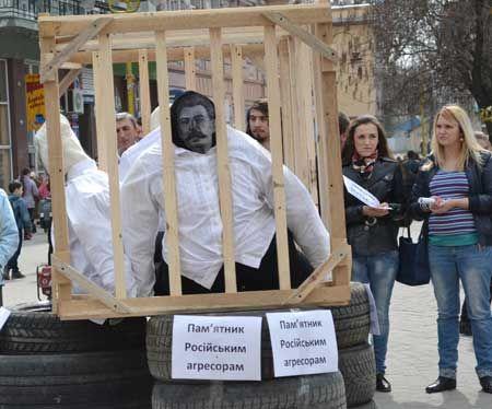 Сьогодні, 31 березня в Івано-Франківську встановили «пам’ятник» російським окупантам. Трьох диктаторів імперії активісти Студентської Свободи посадили у клітку та виставили на Вічовому майдані. В такий спосіб молодь засудила агресію північно-східного сусіда.