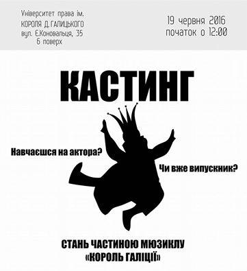 "Не можеш вибрати між вокалом та акторством? Давай поєднувати. Ми продовжуємо набирати акторів для участі в мюзиклі віком від 20 до 40 років. Приходь на кастинг "Король Галіції" та поєднай свої таланти", - закликають організатори.