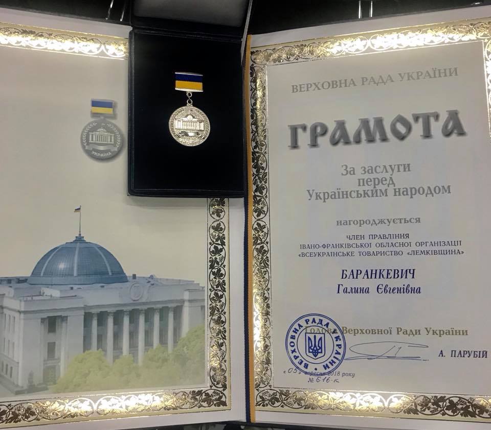 "Ось така нагорода!!! Медаль Верховної Ради України за ініціативу у створенні лемківського драми концерту «Вигнані з раю». Але найважливіше для мене,щоб проект побачила вся країна.Щоб ми розуміли що відбулося з українцями-автохтонами, щоб страшна історія не повторилась сьогодні, щоб лемківська пісня була на устах у кожного українця!",- написала Баранкевич.