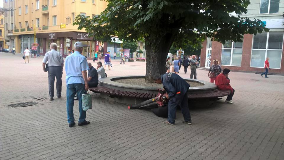 Замість віника - порохотяг. Працівники Муніципальної дорожньої компанії за допомогою ручних порохотягів прибирають середмістя в Івано-Франківську.