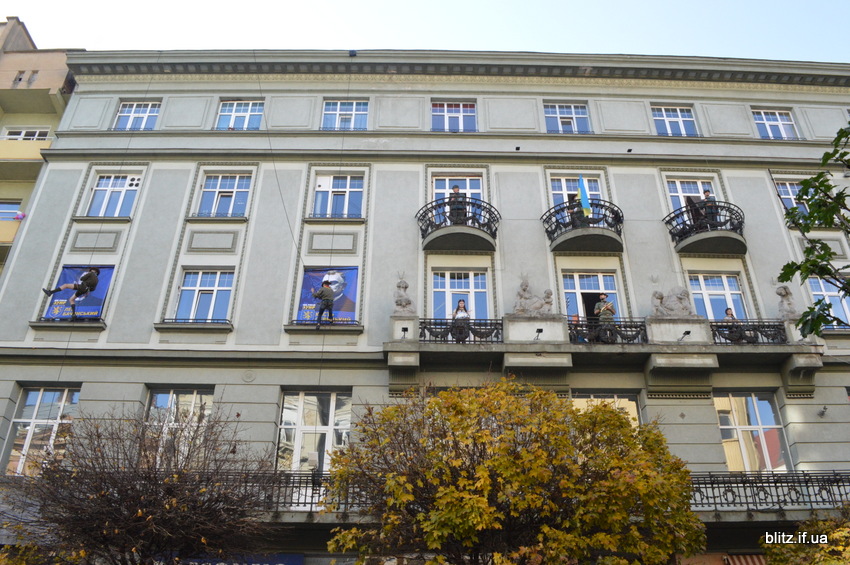 Пластнуни-альпіністи спустившись з даху будівлі розмістили на фасаді портрети Лева Бачинського, Дмитра Вітовського та Костя Левицького.