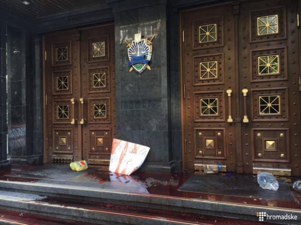 Центральний вхід до будівлі Генеральної прокуратури облили червоною рідиною, схожою на кров.