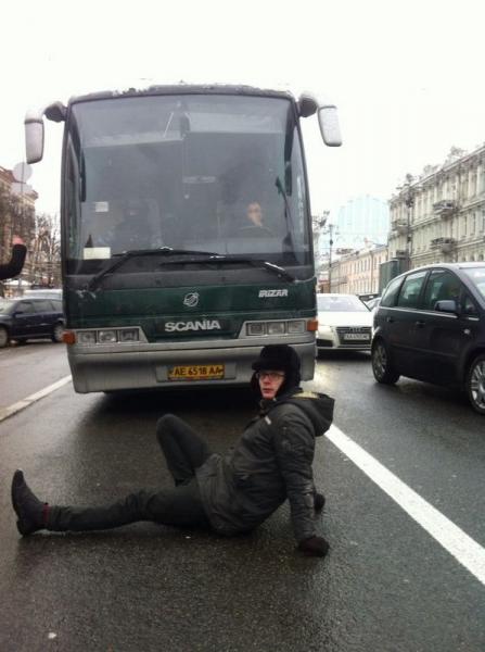 «Пам’ятаєте день, коли під Київраду під"їхало три автобуси «Беркуту», які намагалися взяти будівлю штурмом. Їх поливали водою зі шлангу. В цей час в 200 метрах від Київради, на розі Хрещатика і Богдана Хмельницького під’їхало підкріплення - цілий Neoplan-bus з «Беркутом»! Якби це підкріплення прибуло до будівлі №36 на Хрещатику, невідомо чим би все закінчилося. Але знайшовся один сміливець - молодий хлопець, який ліг поперек дороги і в такий спосіб зупинив підкріплення. Беркут, напевне, спочатку подумали, що він жартує. Було видно, як командир підрозділу підійшов до водія і попросив відкрити двері - напевне, щоб «очистити» дорогу. Хлопець продовжував блокувати рух автобусу з спец-призначенцями. Ще через 5 хвилин до сміливця приєднались двоє: ще один хлопець з прапором і дівчина, які теж приєдналися до такого собі «акту громадянської непокори». Командир підрозділу подивившись на все це, і зрозумівши, що це не його день, прийняв єдине правильне рішення - розвернути Neoplan і поїхати геть», - пише хлопець.