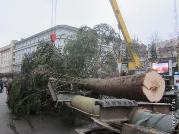 У четвер, 10 грудня, в Івано-Франківськ на Вічевий майдан привезли головну ялинку міста. Зараз її тільки вигружають та беруться за встановлення. Цьогоріч вона – 20-метрова.