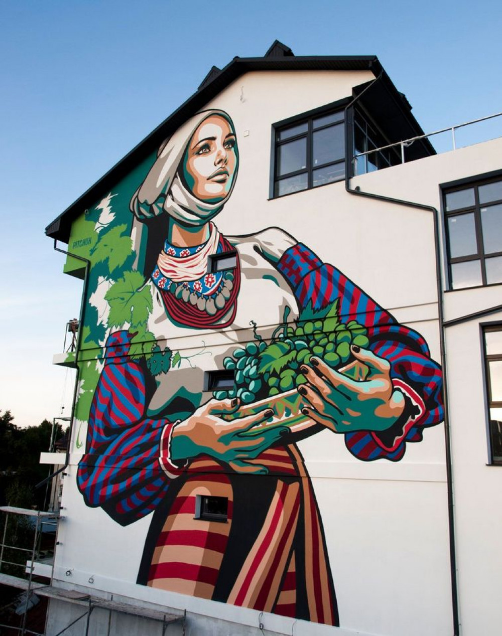 На муралі Юрій Пітчук намалював гуцулку. На дівчині вербовецька сорочка та гуцульські прикраси. У руках вона тримає гуцульську кераміку з виноградом.