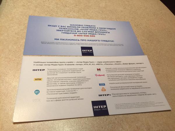 Після того, як оператор кабельного телебачення Ланет відмовився транслювати на Прикарпатті телеканали групи" Інтер Медіа Груп" у поштових скриньках люди почали знаходити листівки від Інтера.