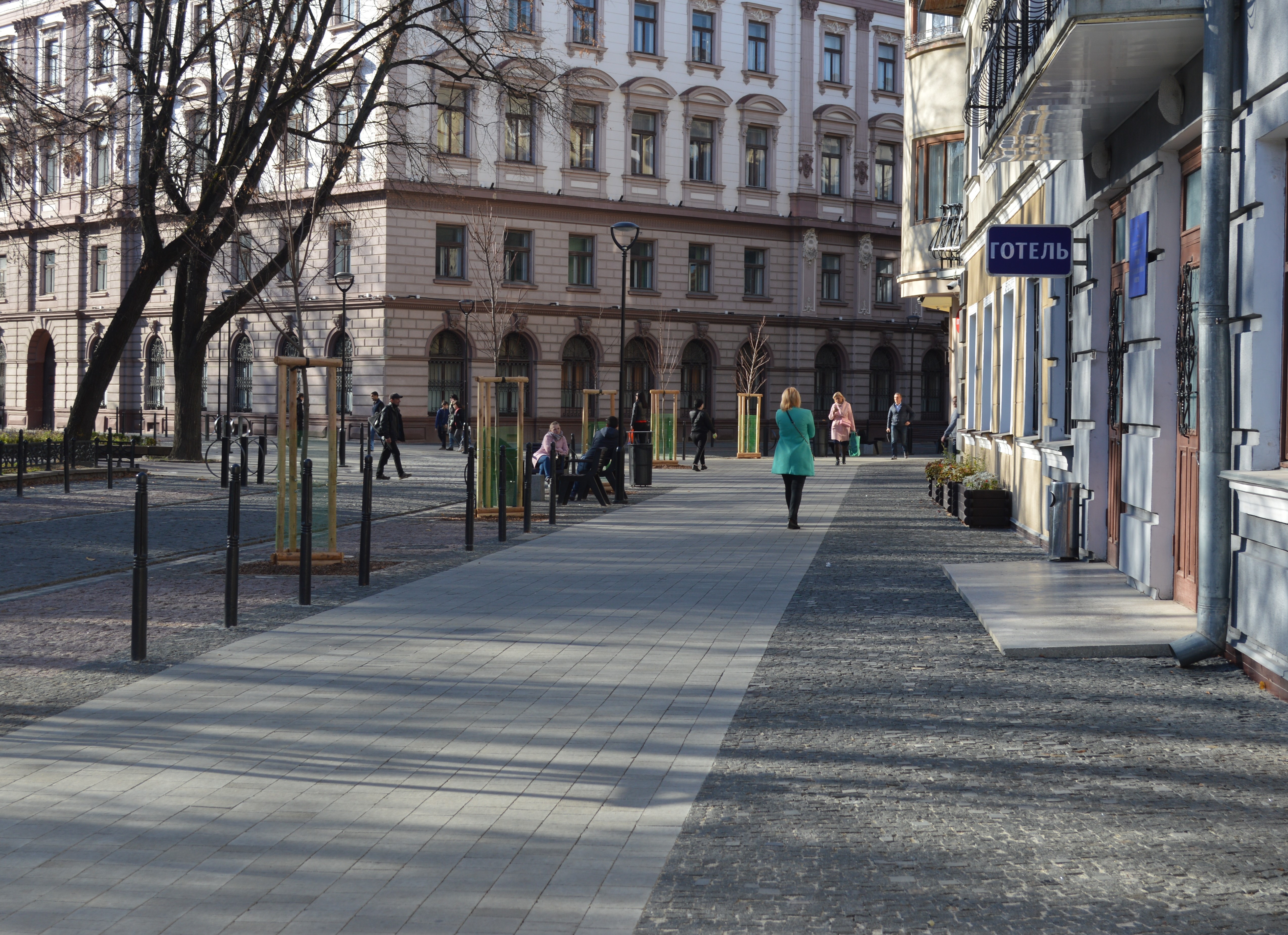 Тепер вулиця Українки та площа Міцкевича вкриті гранітною кам'яною плиткою. Тут теж встановили зручні вуличні меблі та освітлення. Усі цінні елементи благоустрою, які до цього вони мали, також залишились. Перевагу тут мають пішоходи, а не автомобілі, як і має бути в центрі європейського міста.
