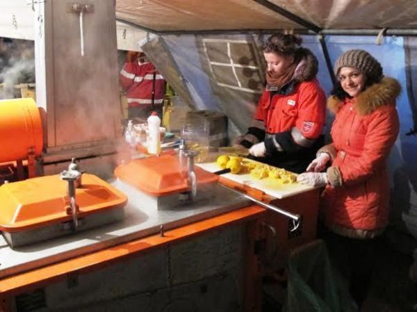 Приготуванням їжі і її роздачею займається 20 волонтерів, які щодня працюють по 14 годин, видають при цьому 3-4 тисячі порцій гарячих страв (овочева зупка, гречана каша з м'ясною підливою, бульйон), та, 3000-3500 літрів чаю (це приблизно 12-15 тисяч порцій).