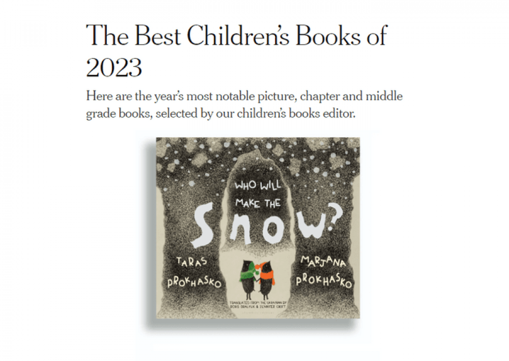 Книжка Мар’яни й Тараса Прохаськів "Хто зробить сніг" увійшла до рейтингу найкращих книжок для дітей та підлітків 2023 року від The New York Times.