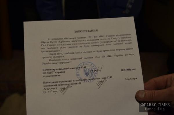 Сьогодні вночі, підполковник Івано-Франківської військової частини 1241 Петро Шуляк, виступив з офіційною заявою від керівництва військової частини, в якій зобов'язується не віддавати явно злочинних наказів та запевнив що особовий склад не буде виконувати явно злочинних наказів. Відео ФТ.