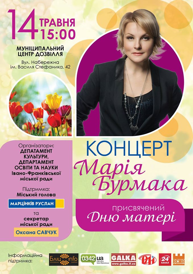 14 травня о 15.00 год. в Муніципальному центрі дозвілля (Набережна ім. Стефаника, 42) відбудеться святковий концерт Марії Бурмаки з творчою програмою до Дня Матері..