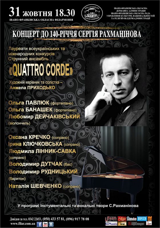Концерт з нагоди 140-ї річниці від дня народження Сергія Рахманінова Учасники -- струнний ансамбль «Quattro Corde» та солісти філармонії Оксана Кречко, Ірина Ключковська, Наталія Шевченко, Людмила Лінник-Савка. Ціна квитків: 20-50 грн. Поч. о 18.30
