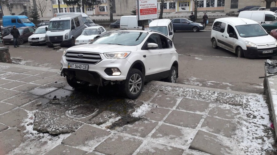 Водій новенького «Ford Kuga», паркуючись біля крамниці «Електрон», замість педалі гальма натиснув на акселератор. Відтак повнопривідний кросовер буквально вилетів на сходи до магазину. На щастя, ні на тротуарі, ні на сходах у той момент не було жодного пішохода, інформують "Вікна".
