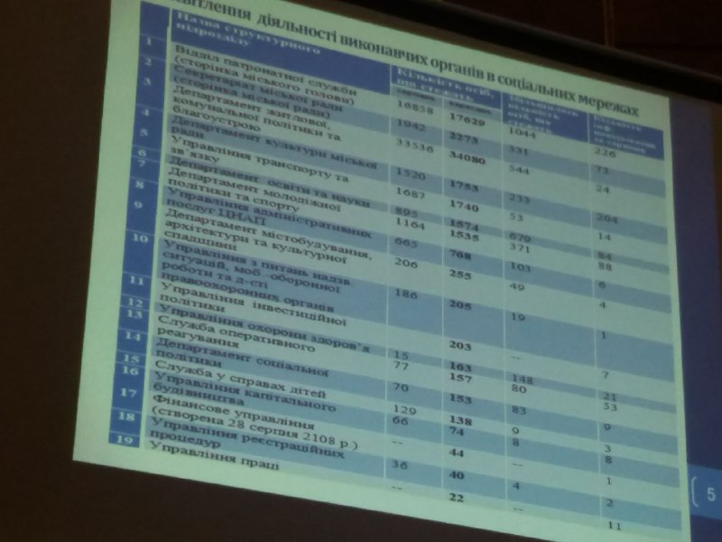 Водночас найбільша кількість підписників на сторінках у соціальнй мережі у департаменту житлової, комунальної політики та благоустрою. Та відділу патронатної служби (сторінка міського голови).