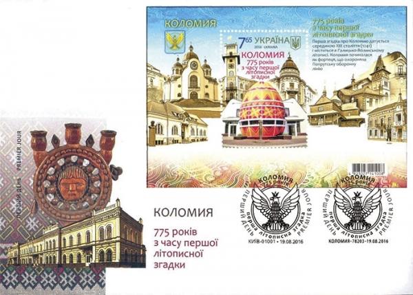 Марка, присвячена 775-річчю від першої письмової згадки про Коломию, розміщена у блоці №143. Вона вийшла в обіг 19 серпня 2016 р. На марці зображені коломийська ратуша, що на проспекті Михайла Грушевського, зведена у 1877 році в неоренесансному стилі. Сама будівля триповерхова, на вежі – герб міста та годинник. Також на марці є візитівка міста – дерев’яна Благовіщенська церква, яка вважається однією з найдавніших сакральних будівель Галичини, та Коломийський музей "Писанка", побудований у 2000 році.