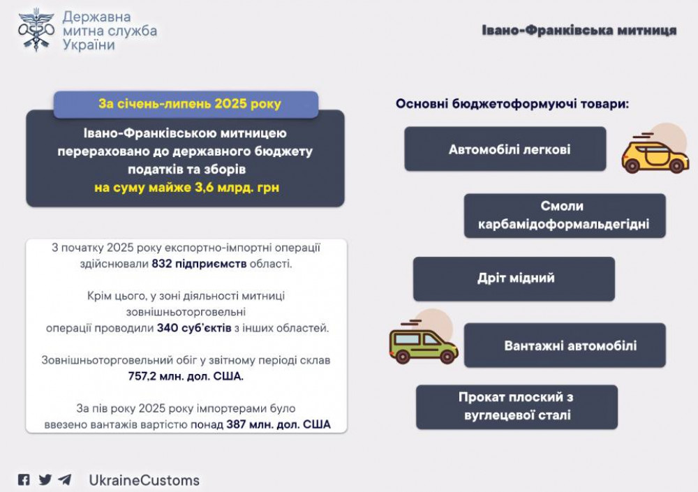 Це стало можливим завдяки активній зовнішньоторговельній діяльності в регіоні. За сім місяців 2025 року експортно-імпортні операції здійснювали 832 підприємства Прикарпаття, а також 340 суб’єктів господарювання з інших областей України, які працюють у зоні діяльності митниці.