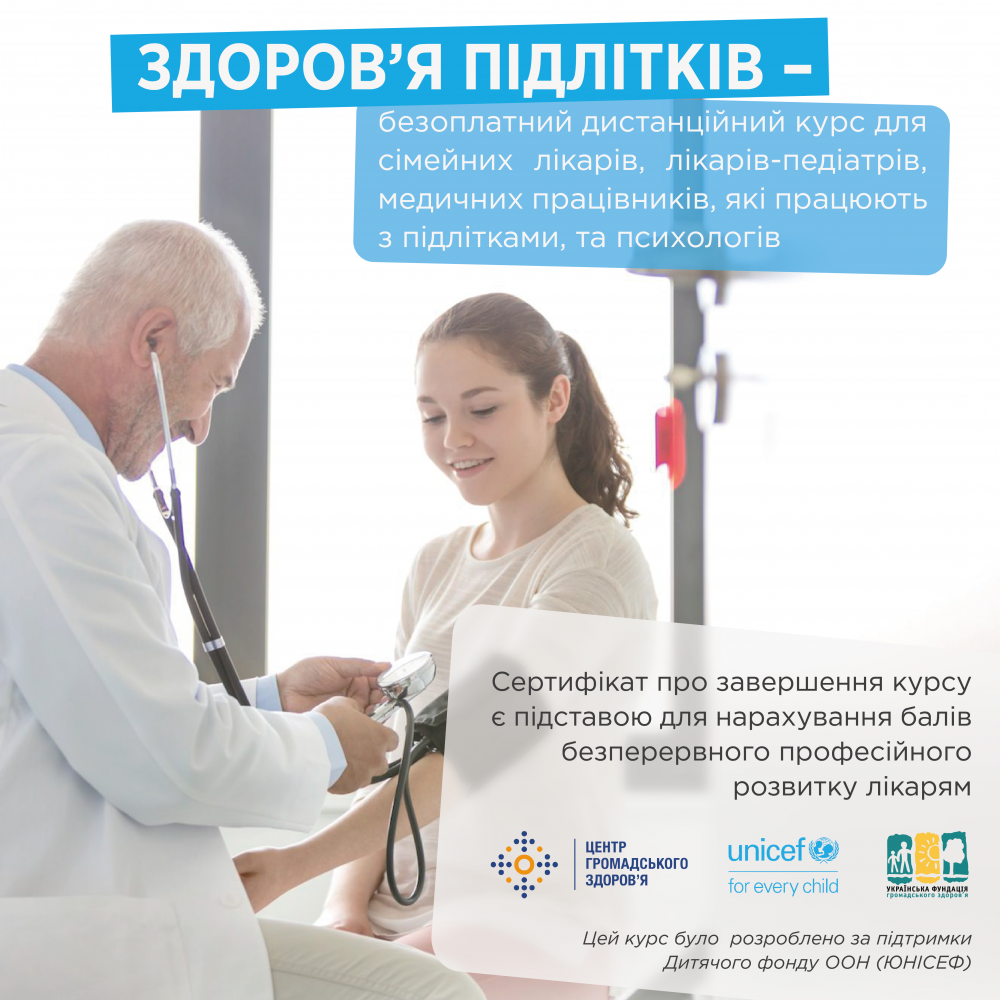 «Центр громадського здоров’я Міністерства охорони здоров’я України» (ЦГЗ) оголошує про початок реєстрації на навчання у першому відкритому дистанційному курсі «Здоров’я підлітків». Курс розрахований на медиків, соціальних працівників та психологів