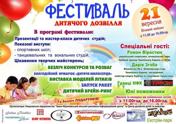 21 вересня на Вічевому майдані Івано-Франківська вдруге відбудеться Фестиваль дитячого дозвілля. З 11.00 до 16.00 батьки та діти зможуть побачити більшість гуртків по роботі з дітьми, які діють у Івано-Франківську.