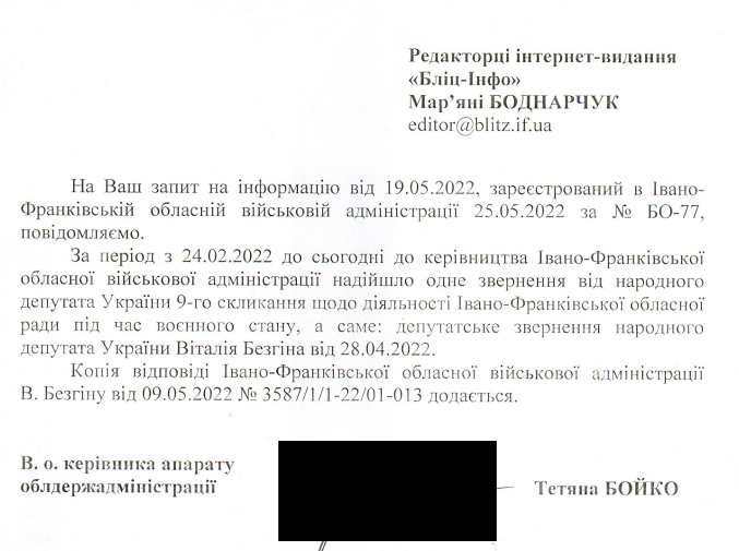 Редакція Бліц-Інфо також звернулася з цього приводу за коментарем до народного депутата від "Слуги народу" Віталія Безгіна. А саме, поцікавилася, з якою метою нардеп запитував інформацію про засідання обласної ради та чи це стосується це можливості розпуску обласних рад. Наразі відповіді ми не отримали.