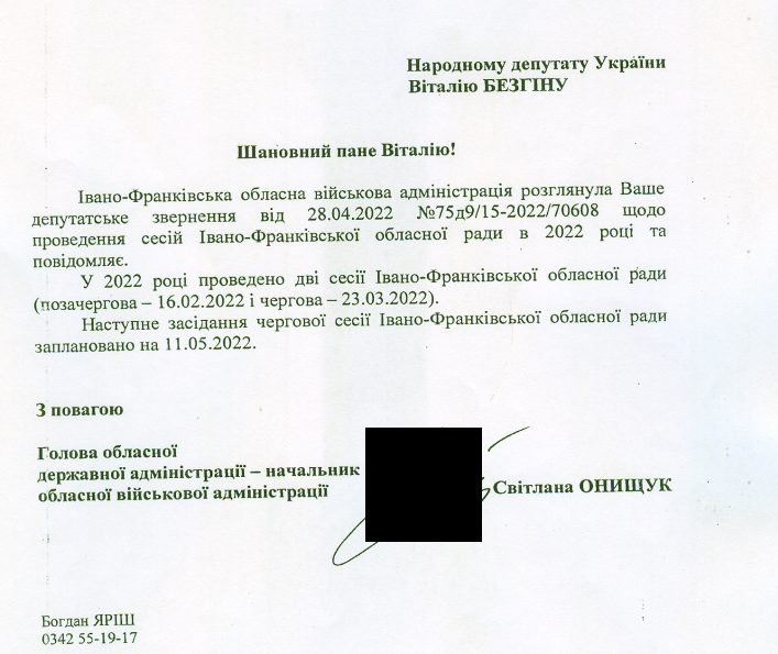 Та схоже на цьому провладна партія вирішила не зупинятися - “Слуги” також розглядають варіант розпуску обласних рад. А підтверджує це збір інформації про діяльність обласних рад у 2022 році народним депутатом від “Слуги народу” Віталієм Безгіном. Обранець також є членом Комітету з питань організації державної влади, місцевого самоврядування, регіонального розвитку та містобудування. Так, у відповідь на запит редакції “Бліц-Інфо” Івано-Франківська обласна військово-цивільна адміністрація повідомила, що у травні надавала Безгіну інформацію щодо проведених сесій Івано-Франківської обласної ради у 2022 році. У чому ж сенс такої інформації? Все просто - якщо обласна рада протягом кварталу не провела жодного засідання, її можна розпустити. До слова, під час війни у більшості областях і справді не проводили сесій, за “рекомендаціями” з офісу Президента. Мовляв, росія обирає адмінбудинки як цілі для ракетних обстрілів, тож проводити засідання буде небезпечно. Так, за джерелами Бліц-Інфо, Івано-Франківська обласна рада за наполяганням ОВА кілька разів переносила заплановані засідання. Зокрема, перед 9 травня.