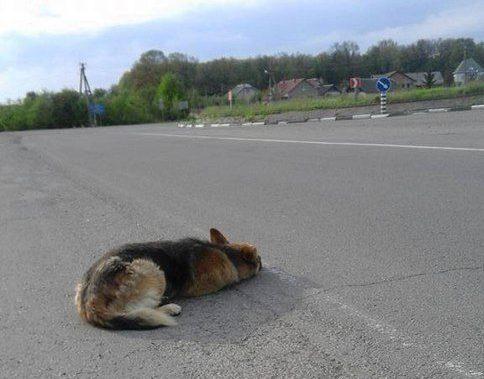 На Франківщині покинутий пес лежить посеред дороги і чекає господаря