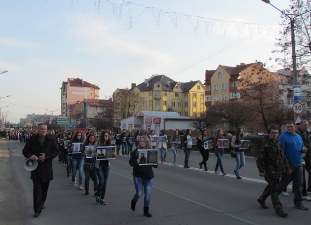 Депутат Калуської міської ради Олег Нижник — між рядами учнів віддає розпорядження. Колона підходить до ПК «Юність». Там вчора відбувся вечір-реквієм «Небесну сотню вже зустріли небеса».