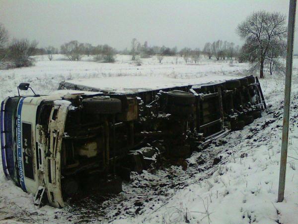 Водій автомобіля МАН не справився з керуванням та з’їхав з автодороги і перекинувся. На даний час проводяться роботи щодо перевантаження вантажу (паперу) та витягування даного автомобіля.
