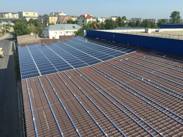 Загальна площа покриття даху фотомодулями - 646 м². Для установки модулів використали алюмінієва конструкція чеської фірми KrajiCzech. А також три інвертора HUAWEI потужністю 30 кВт для перетворення постійного струму з сонячних модулів в змінний.